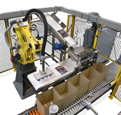 Эта система предназначена для автоматической упаковки картонных коробок, винных бутылок, металлических банок и пластиковых контейнеров. Комплект включает в себя линию сортировки продукции, двухкоординатного робота, раму, приспособления и главный шкаф управления. Он может быть легко интегрирован с автоматами для сборки коробок, заклейщиками коробок и паллетайзерами для создания полностью автоматизированной производственной линии.